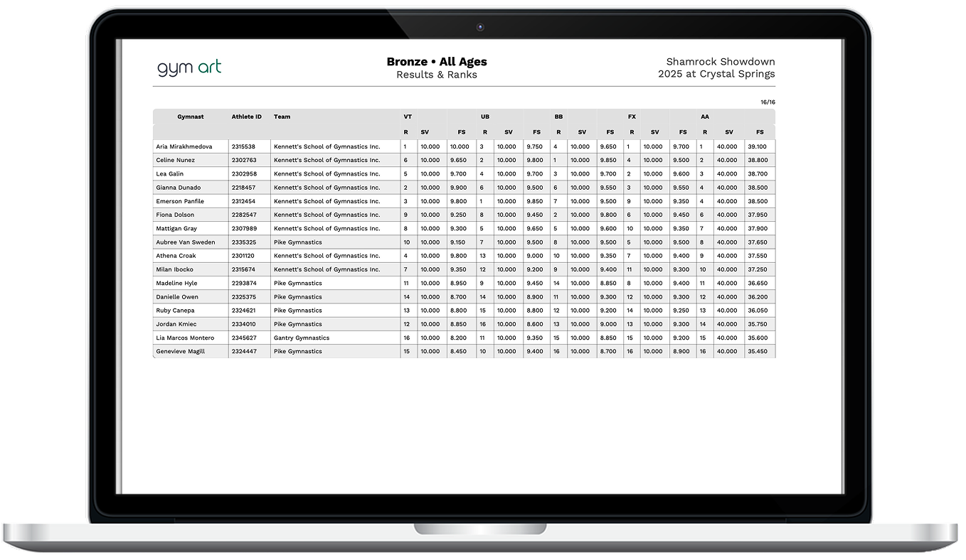 Gym Art Meets let’s you easily make gymnastics events, handle scoring, ranking, and video uploads for all levels, age groups, for teams, and for WAG and MAG.