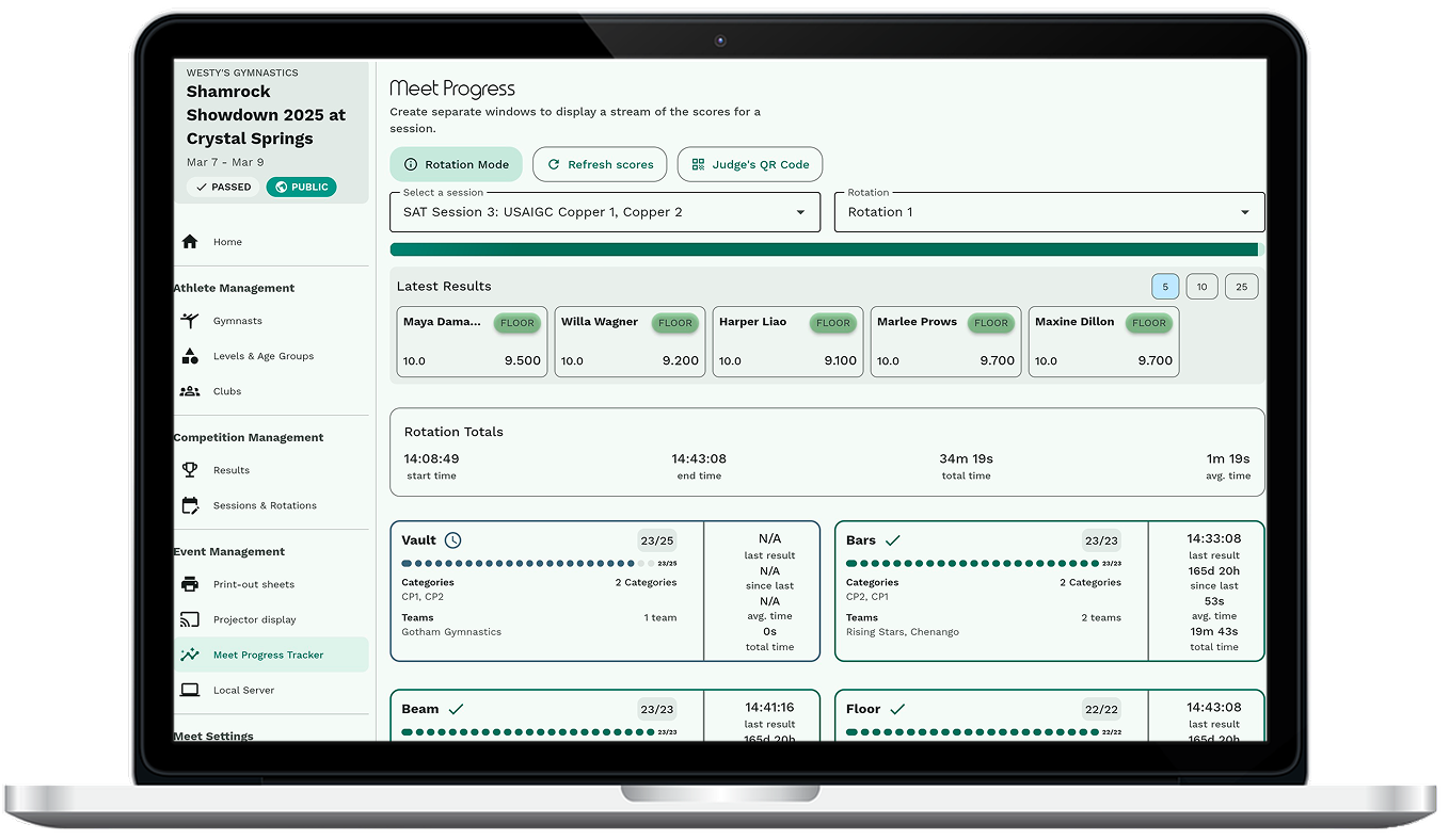 Gym Art Meets is designed specifically for gymnastics event organizers and admins. It is a software suite that provides tools to handle gymnast data, scores, and more.