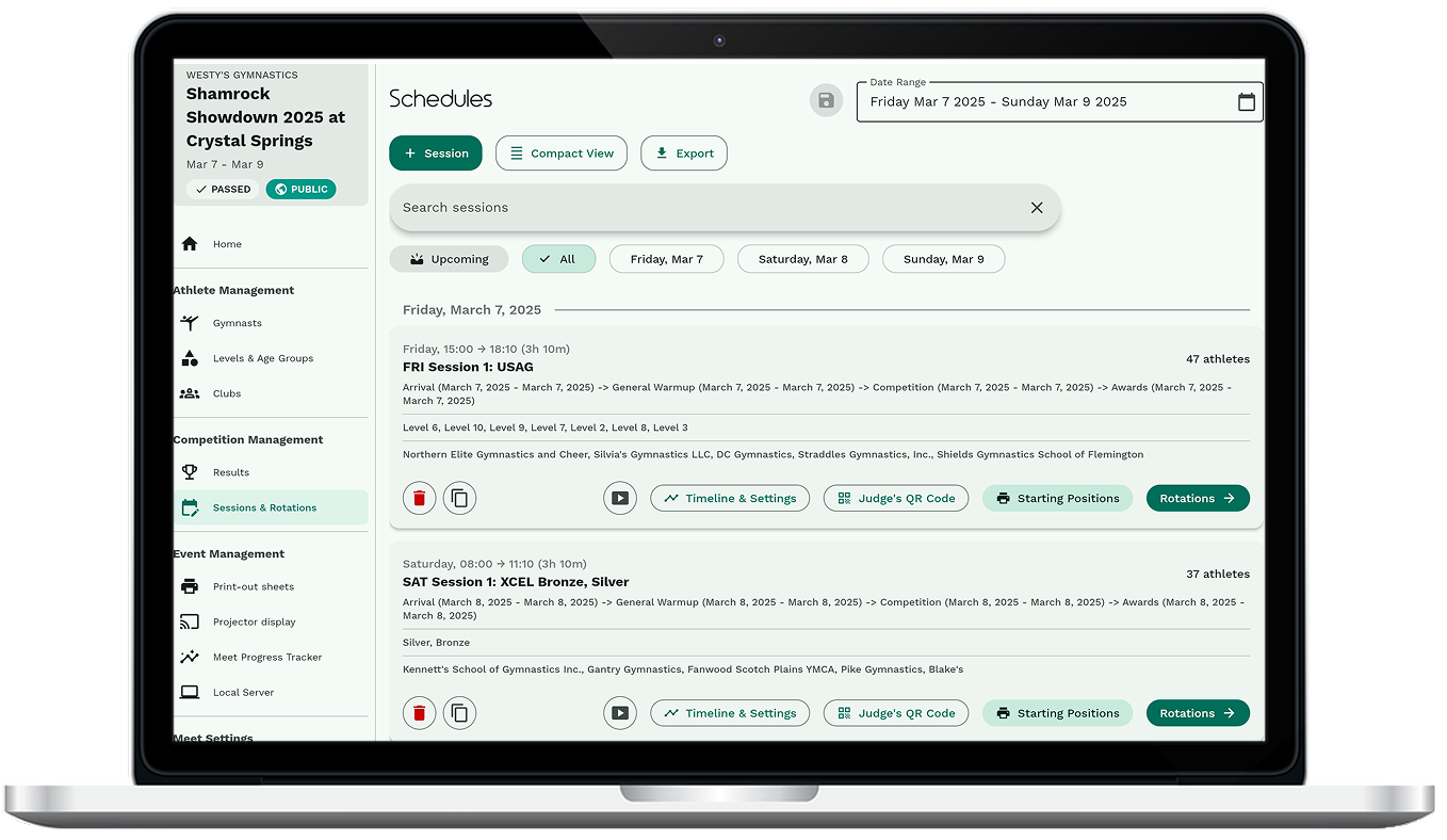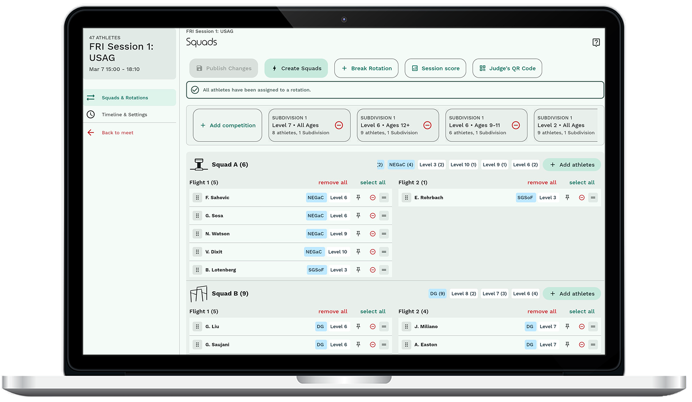 We provide a super simple tool for you to add gymnasts to sessions and set their squads (rotations/groups). Once you’ve imported your athletes you can rapidly create your schedule and share it online.