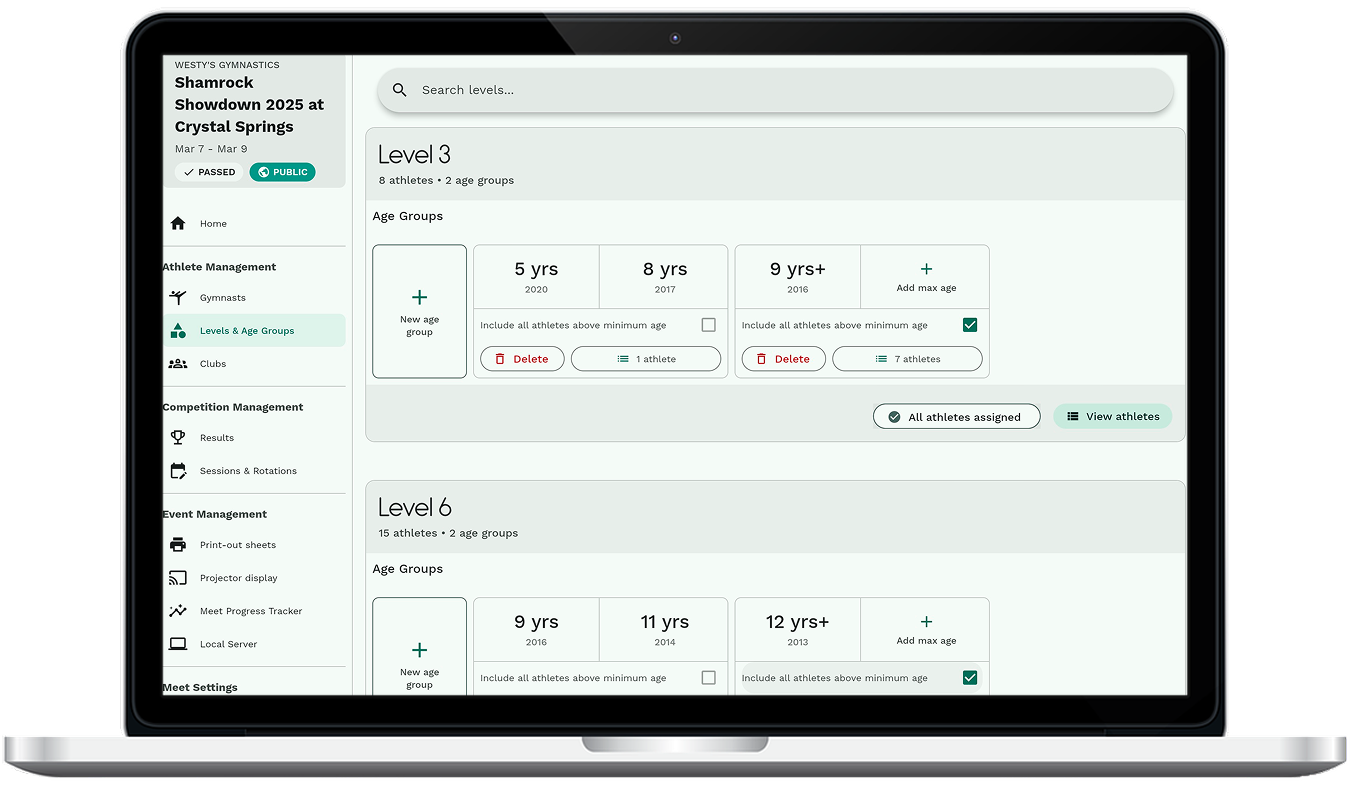 Handle scoring for all of your levels and age groups. With Gym Art Meets you can easily import your gymnasts, and the software will automatically group gymnasts together by level and age group. Whether it’s out of 10, or it’s an FIG score, Gym Art Meets can handle it!